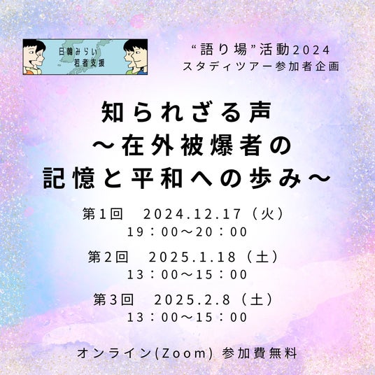 「日韓みらい若者支援事業」では、2024年12月17日(火)、2025年1月18日(土)と2月8日(土)に、オンラインで在外被爆者の歴史や体験を学ぶ”語り場”活動を開催します!