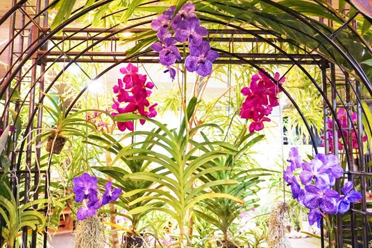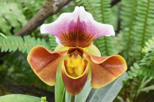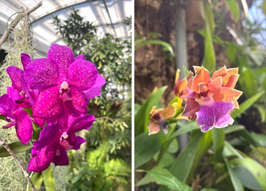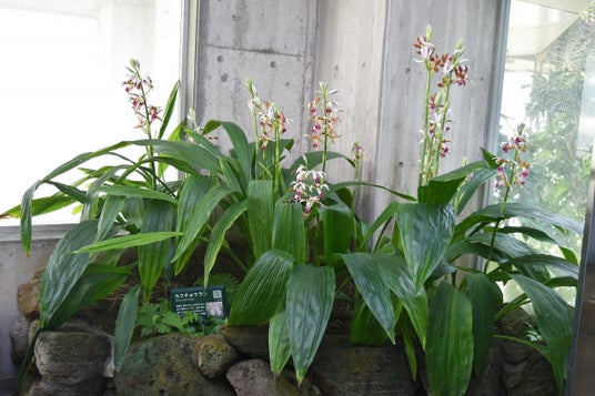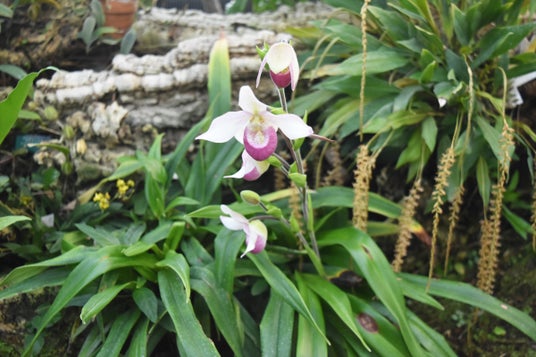 当館は、東南アジアの熱帯雨林を再現した植物館です。実際の熱帯雨林では、樹木の幹や枝・岩や石などに付着して育つ「着生ラン」と、地中に根をはり、地中に含まれる養分や水分を吸収して育つ「地生ラン」の2種類のランがあり、当館でも数多く展示しています。