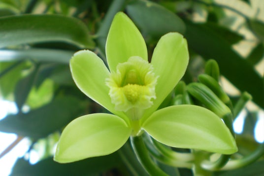 スイーツなどでの人気の高い「バニラ」も、実はラン科の植物です。熱帯や亜熱帯地域で栽培されており、ランの仲間では珍しい”つる性植物”で、他の樹木等に絡んで成長します。当館でも毎年美しい花を咲かせる「バニラ」について、解説パネルなどでご紹介します。