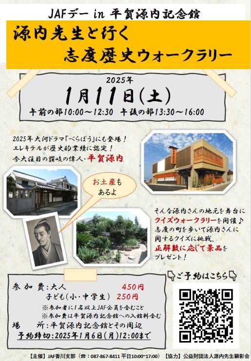 JAF(一般社団法人日本自動車連盟)香川支部(支部長 灘波 順一)は、2025年1月11日(土)平賀源内記念館にて、源内先生と行く志度歴史ウォークラリー♪JAFデーを開催します。