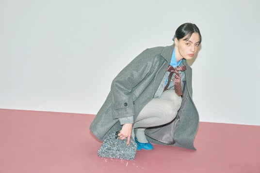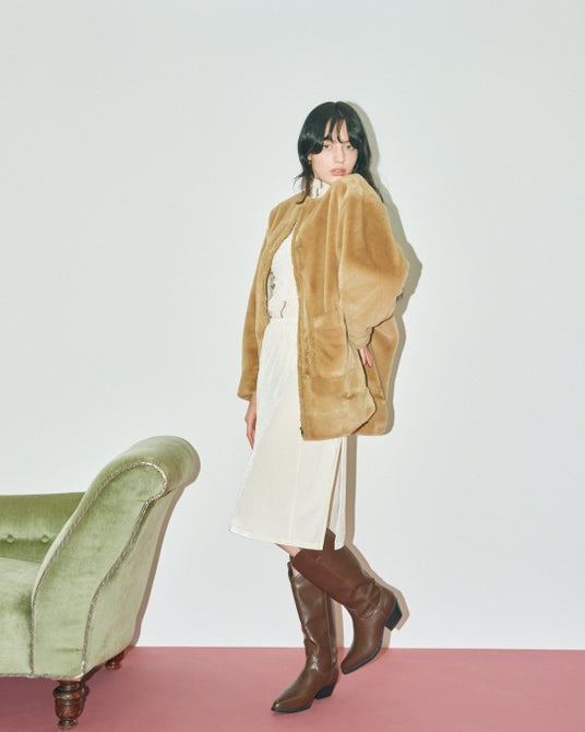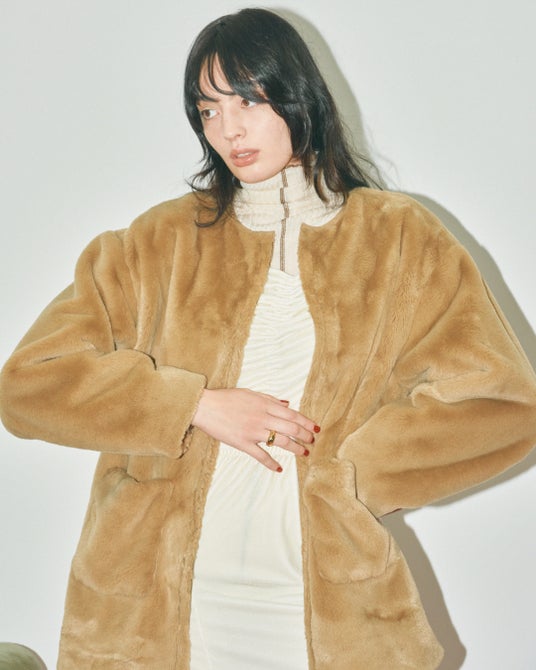 ボリュームがありながら上品なノーカラーで、すっきりとした女性らしい印象に。大人っぽいカラーリングも魅力のファージャケット。