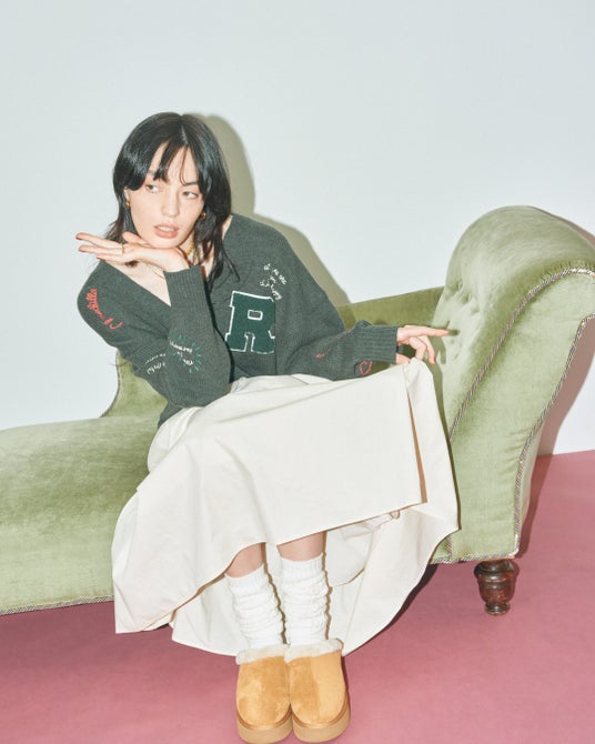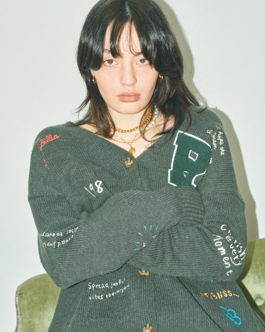 サガラワッペンと手書き風の刺繍を散りばめたクラフト感のあるカーディガン。ルーズに着こなせるオーバーシルエットで、古着のカレッジニットのようなレトロな雰囲気がたまらないアイテムです。