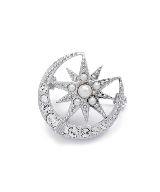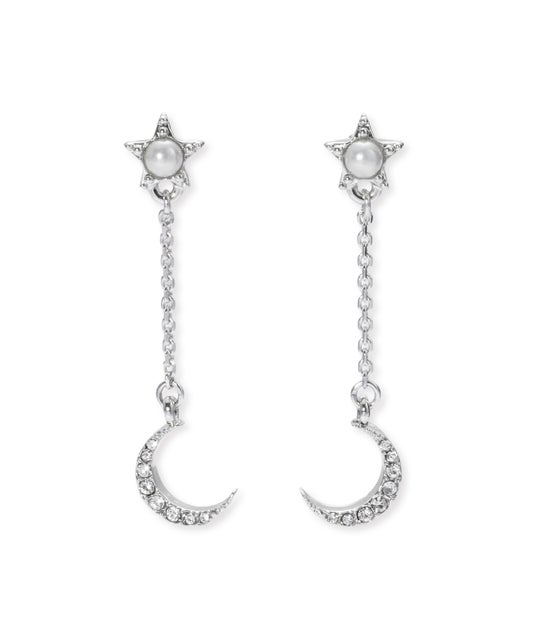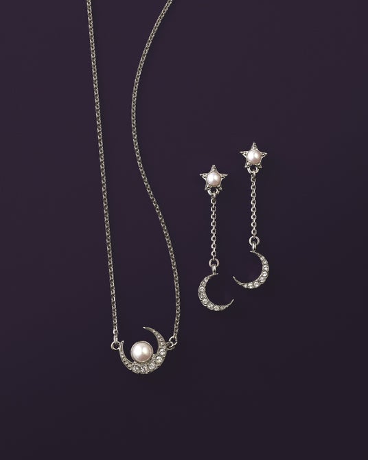 ロマンティックなムードの三日月モチーフネックレス。パールとカットガラスのきらめきが優しく上品な印象。三日月が揺れる縦長シルエットのピアスは顔周りをすっきりと見せてくれます。シルバーとゴールドの2色展開。