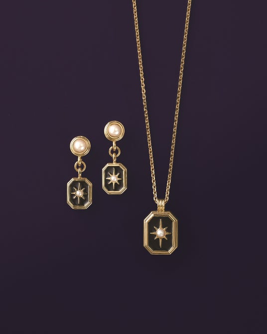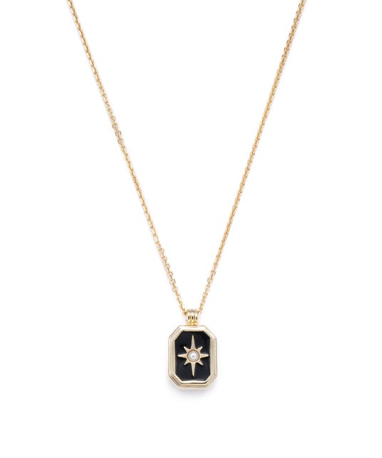 夜空に星が瞬くように、シックなブラックカラーの中央に星が浮かび上がる神秘的なデザイン。小粒のパールをあしらい辛口になりすぎない印象に。ネックレスの裏面にはブランドロゴの刻印とカットガラスがあしらわれ、リバーシブルで着用可能。