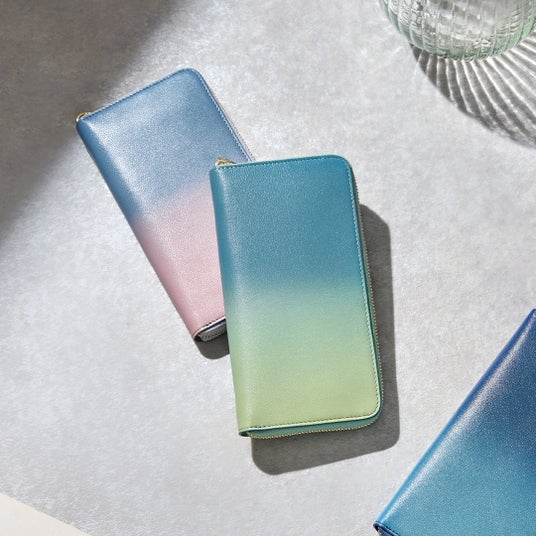 四季折々の草花や景色、季節の移り変わりの中で煌めく一瞬の輝きを、グラデーションで表現したイロドリシリーズのレザー小物。手仕事で染められた1枚の大きな革から、職人たちがカットする革の位置やパーツの組み合わせによって、一つ一つが個性豊かな表情を持って生まれます。「桃」「花笑」「涼風」の3色は、「カラーズ ― 色の秘密にせまる」展での先行販売(※)です。季節の風景を楽しむように、一期一会のワクワク感をお楽しみください。