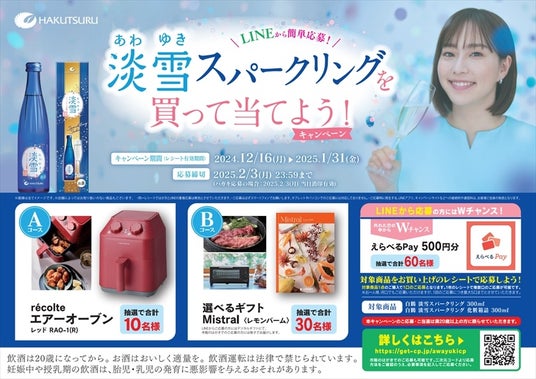 白鶴酒造株式会社は、「白鶴 淡雪スパークリングを買って当てよう!キャンペーン」を2024年12月16日(月)から実施します。「白鶴 淡雪スパークリング 300ml」を購入後にLINEまたはハガキで応募すると、抽選でノンオイルフライヤーなど豪華賞品が100名様に当たります。