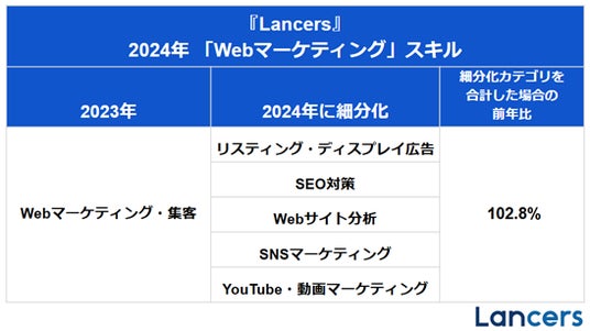 過去のスキルランキングで「Webマーケティング・集客」は2022年に7位、2023年に3位と上位にランクインしていましたが、2024年はランク外となりました。これは、『Lancers』が従来のカテゴリを「SEO対策」「SNSマーケティング」「Webサイト分析」「YouTube・動画マーケティング」「リスティング・ディスプレイ広告」の5つに細分化したことが要因です。