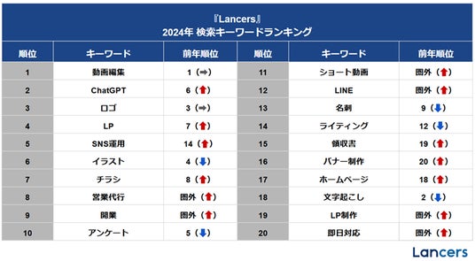 ランサーズ株式会社(本社:東京都渋谷区、代表取締役社長 CEO:秋好 陽介、東証グロース:4484、以下「ランサーズ」)は、フリーランスマッチングプラットフォーム『Lancers』において集計した「2024年必要とされたスキルランキング」をフリーランスの日(12月16日)に公開しました。本ランキングは、『Lancers』上の仕事カテゴリ別の発注数や検索されたキーワードを基に作成しています。2024年は政府の感染症分類変更に伴う規制緩和による“アフターコロナ”の社会変化や、生成AIの普及が進展したことで、フリーランス市場におけるスキル需要に大きな変化が見られました。特に生成AIの活用、新規事業の立ち上げ、SNSマーケティングの需要拡大が2024年のスキル市場を牽引しています。2025年に向けて、取引先企業の皆様にはご依頼時のご参考に、ランサーの皆さまには出品時のご参考にしていただけますと幸いです。