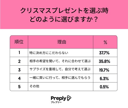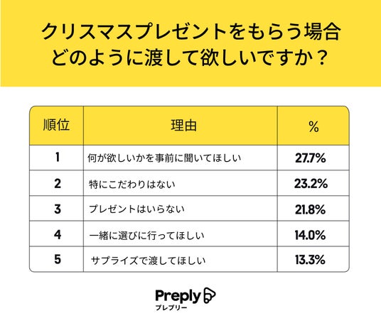 世界中のオンライン英会話講師と生徒をつなぐ、オンライン語学学習プラットフォーム Preply(プレプリー)は、文化やコミュニケーションを大切にしています。贈り物を贈ることは、相手への思いを表現したり、大切な相手に心からの願いを伝える大切な手段です。そこで今回は、クリスマスプレゼントの選び方や、もらう側の本音、さらにはプレゼントNGアイテムなどを、20歳~39歳の男女600名に調査しました。