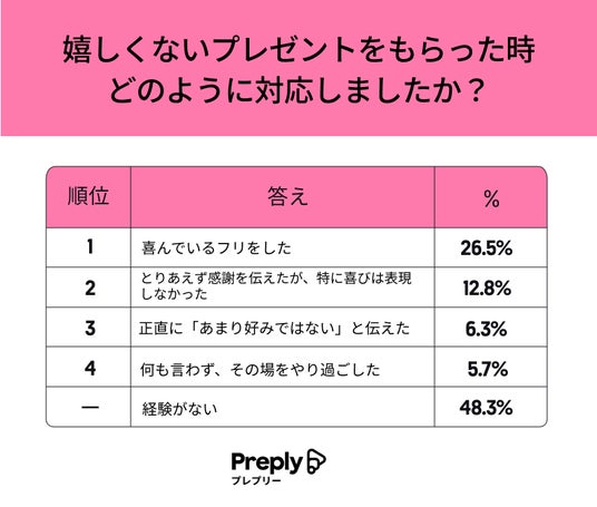 最後に、嬉しくないプレゼントをもらったときの対応について尋ねたところ、約3割(26.5%)が「喜んでいるフリをしたことがある」と回答しました。この結果から、多くの人が「嬉しくない」という本音を隠して、相手や場の雰囲気を気遣っていることがわかります。プレゼントには贈り手の時間や労力、そして「喜んでもらいたい」という思いが込められています。その努力や気持ちを否定しないために、受け取る側があえてポジティブな反応を装うことがあるのでしょう。