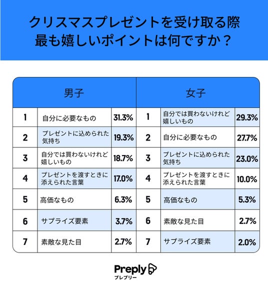 「あなたがクリスマスプレゼントを受け取る際、最も嬉しいポイントは何ですか?」という質問をしたところ、男性と女性では異なる視点が浮き彫りになりました。