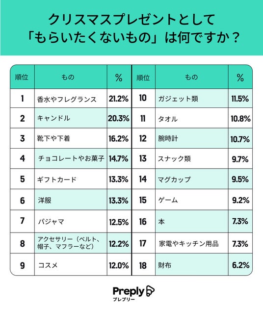 – 「もらいたくないプレゼント」の1位は香水(21.2%)、続いてキャンドル(20.3%)、靴下や下着(16.2%)がランクイン。「無難なプレゼントほどリスクが高い」という結果に。