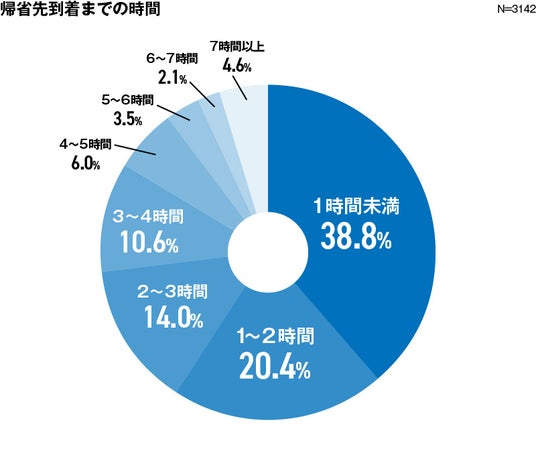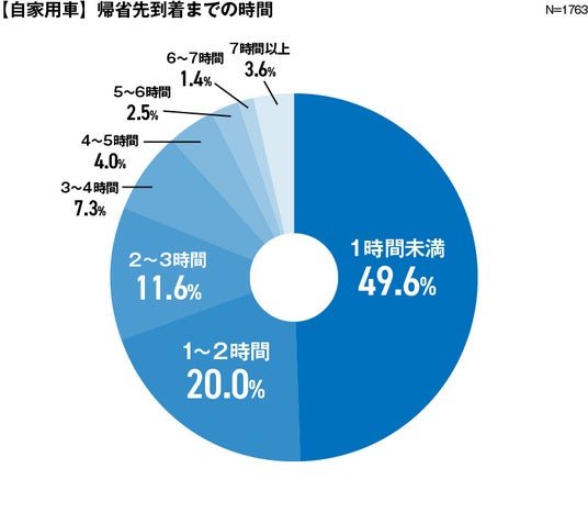 次に、「時間」にフォーカスを当て、「帰省先到着までにかかる時間」を尋ねました。すると「1時間未満」が最も多く4割弱(38.8%)、3時間以上かかる人が3割弱(26.8%)と二極化傾向に。クルマで3時間以上となればある程度の長距離運転が予想されますが、自家用車で帰省する人に絞った結果をみても、3時間以上の長距離帰省ドライバーが約5人に1人、2割近く(18.8%)存在しています。