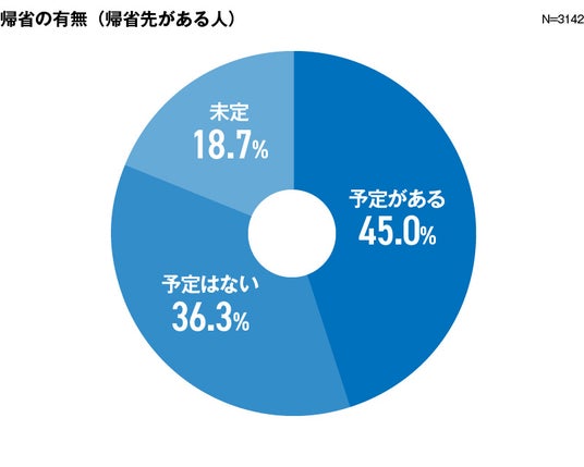 年の瀬が近づき、年末年始のカレンダーを眺めながら仕事納めのタイミングや帰省先での過ごし方を考えている方も多いのではないでしょうか。今回実施した調査ではまず、帰省先がある人に年末年始の帰省予定を聞きました。すると、帰省予定のある人は45%と半数近く。未定と答えた人も含めると、7割程度が帰省をするか、検討中であるといえます。
