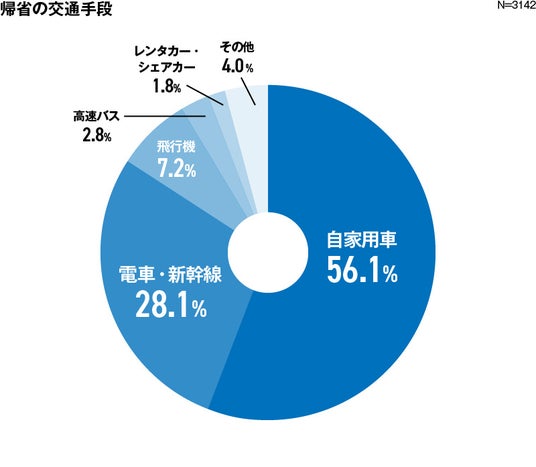 帰省スケジュールが決まったら、次に決めるのは交通手段です。そこで、帰省に用いる交通手段を聞きました。圧倒的1位となったのは自家用車。その比率は56.1%と半数以上にのぼり、2位の電車・新幹線(28.1%)の約2倍になっています。