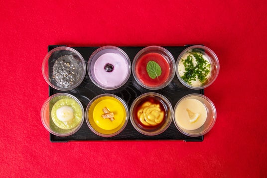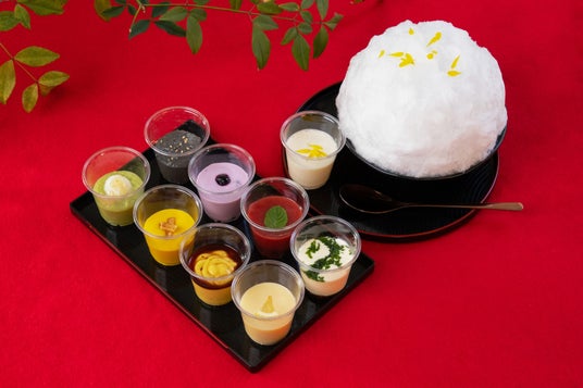 ■特長: 御節氷は、和食の基本である五味五色をかき氷で表現した贅沢な一品。お好みに合わせて、8種類のソース+ミルクを氷にかけ、その組み合わせをお楽しみいただけます。