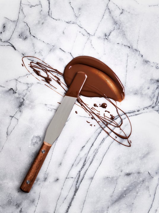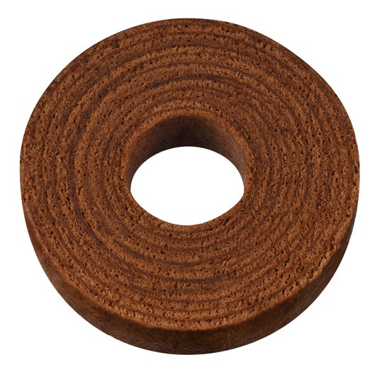 まずは昨年より生クリームを増量しました。増量することによって、生地がよりしっとり柔らかな食感になります。さらに、生地にはスイス産のカカオの香り高いチョコレートをたっぷりと配合しています。バウムクーヘンの生地はチョコレートがたくさん入っていると、芯棒から落ちやすくなり、焼くのがとても難しくなります。しかし、そこにユーハイムの職人の技術が加わることにより、チョコレートたっぷりでもおいしくバウムクーヘンを焼くことが出来るのです。