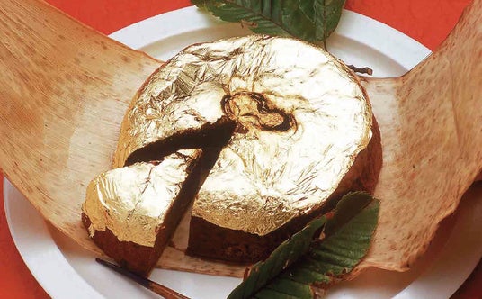 ベルギー産のビターチョコと栗を使った、金箔で覆われた華やかなお菓子です。