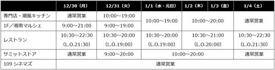 ※飲食店のラストオーダー(L.O.)は店舗により異なります。 ※一部日程で営業時間が変更になる場合がございます。※1月5日(日)以降は通常営業となります。ただし、4F レストランの営業時間は、12/21(土)~12/29(日)10:30~22:30(L.O. 21:30)、1/5(日)10:30~22:30(L.O. 21:30)となります。