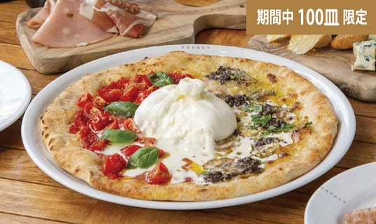 圧倒的な人気を誇るブッラータのピッツァを、フレッシュトマトとトリュフのハーフ&ハーフにアレンジしました。