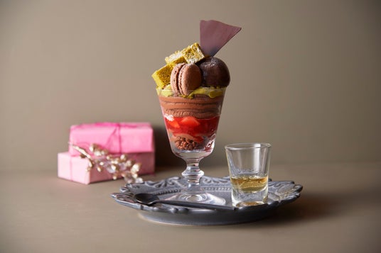濃厚なチョコレートアイスとマカロン、ピスタチオのクレマの下で、チョコクリームのラム酒が薫る大人のパフェ。甘酸っぱいいちごソースがアクセントに。お好みでイタリアの醸造酒グラッパをかけてお召し上がりいただけます。