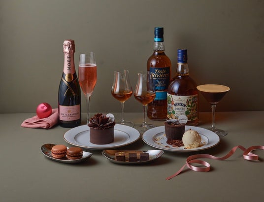 人気のショコラメニューとお酒のペアリングコース。マカロンとシャンパン、スペシャリテのケーキ「フイユ・ドトンヌ」とコニャック、ボンボンショコラとラム、アイスを添えた温かいフォンダンショコラとエスプレッソマティーニと続く贅沢なコースを堪能できます。