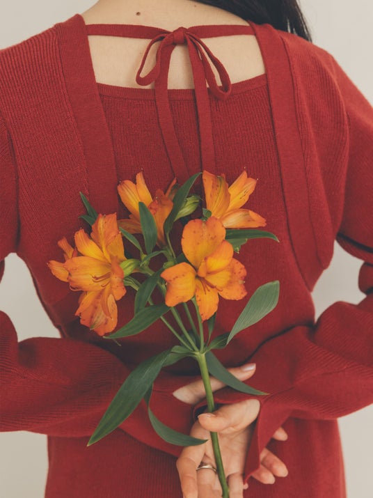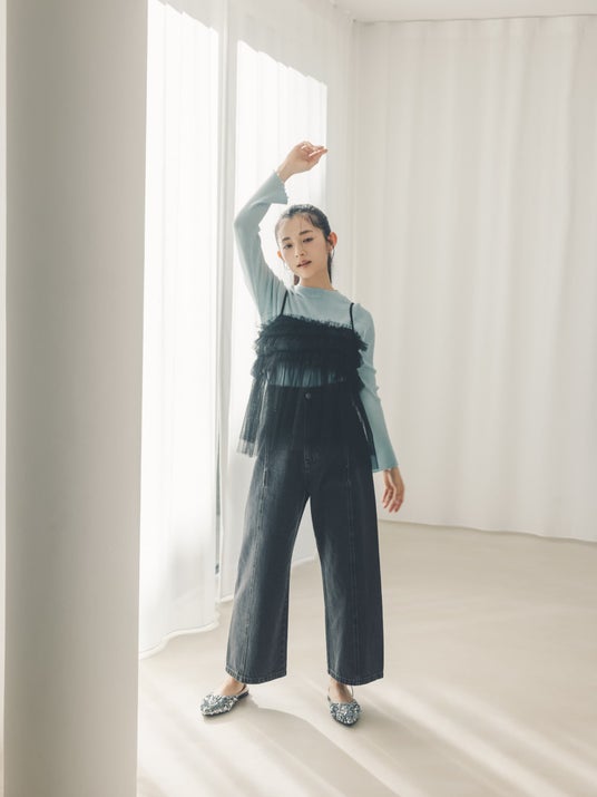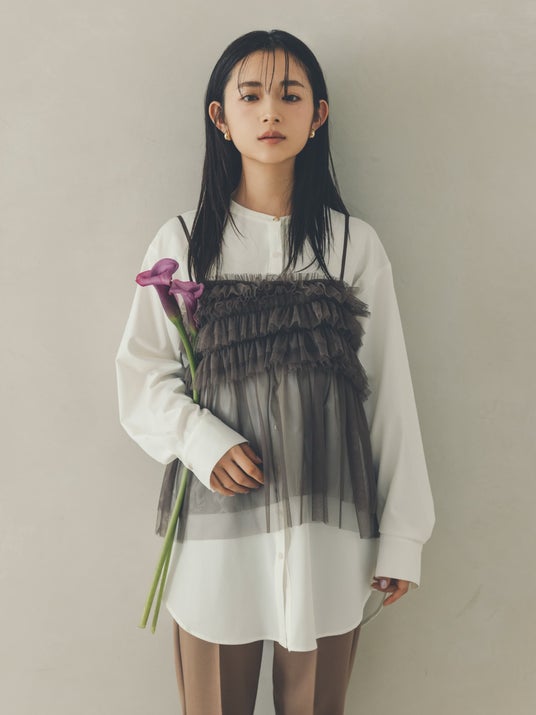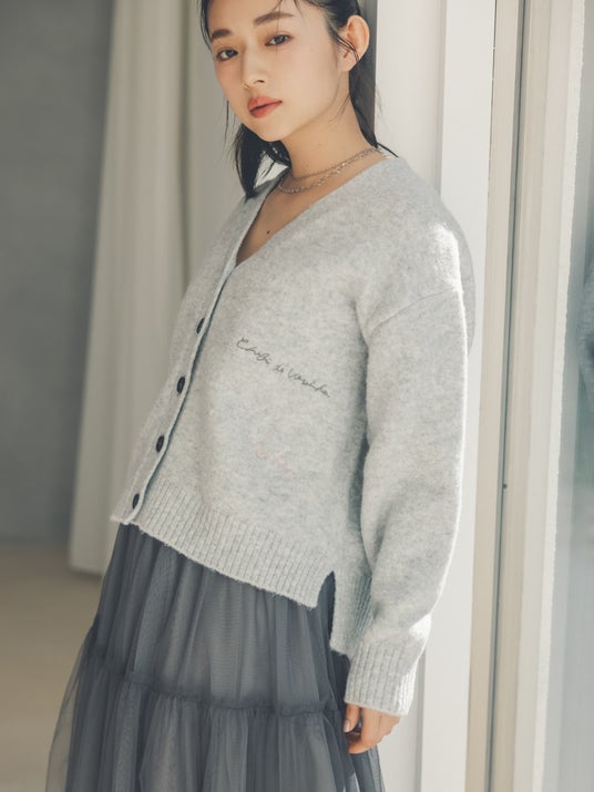 柔らかで毛足のあるフェザーヤーンを使ったカーディガンは、スクエアモチーフのクロシェ風柄に編み立てることで、春らしい透け感のある軽やかな仕上がりに。曖昧なカラーを重ねた軽やかなチュール素材が織りなす、レイヤードスタイルは、まるで春の風に乗ってひらひらと揺れる花びらのようです。
