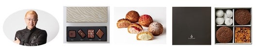 左から)石川県七尾市出身の辻口 博啓氏、C.C.C. 能登の大地の恵み(4個入) 2,501円、珠洲の塩シュークリーム1月販売:プレーン・ノワール、2月販売:いちご・ノワール(各1個、2個入)各1,301円、サブレショコラ ボヌール(1缶)3,201円