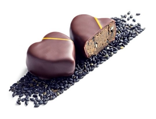 美味しそうな香ばしいノートを奏でるハート。黒ゴマのプラリネの思いがけない味わいとゴマの繊細な粒々感を堪能いただけます。クリーミーでとろけるような口溶けがたまらない斬新な一品。