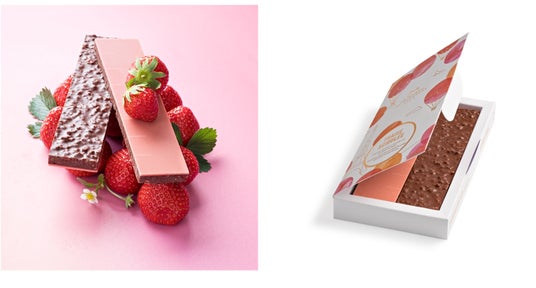 内容:ドライストロベリーを混ぜ込んだカカオ56%のダークチョコレートにイチゴ風味のチョコレートプレートを重ねたタブレット。