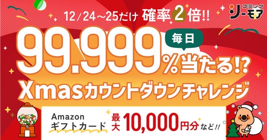 コミックシーモアでは現在、LINE IDを連携すると1日1回までの抽選でその場で当たる、「99.999%当たる!?Xmasカウントダウンチャレンジキャンペーン」を実施しております。毎日コミックシーモアにきて、ぜひご応募ください。