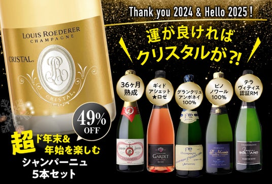 2024年ご愛顧いただいたお客様への日々の感謝を込めた、年末年始をさらに特別な時間にする「年末&年始を楽しむシャンパンセット」を販売します。このセットにはプレステージシャンパンが当たるシャンパンセットの特別バージョンで、当たりの商品として100セットに1セットの確率で、5本のうち1本は「ルイロデレール クリスタル」になってお届けする人気のセットです。