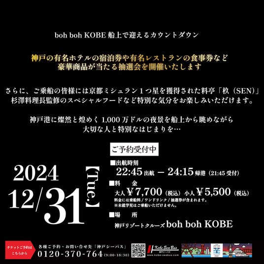 boh boh KOBE では 4 度目となるカウントダウンクルーズとなります。今年も、神戸の有名ホテルの宿泊券や有名レストランの食事券、神戸ならではのスイーツ等の商品券が当たる抽選会を開催いたします。