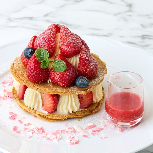 練乳バタークリーム、あまおうとレモンのホイップ、バニラアイスクリームをサンドしたサクサクのパイの上に、甘酸っぱい「あまおう」を贅沢にトッピング。ストロベリーソースとともに。