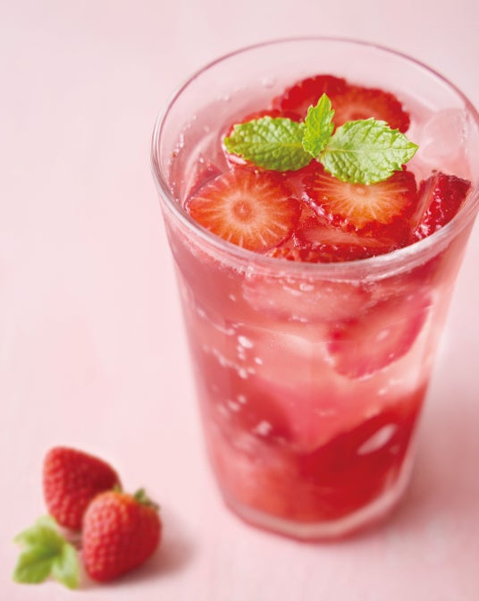 爽やかな酸味のストロベリーハイビスカスティージュレに、ストロベリーローズソース、苺、ソーダを合わせました。