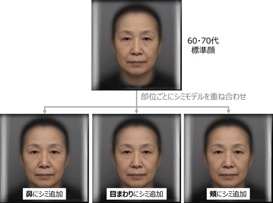 シミと対人印象の関係を評価するにあたり、実在する60~70代の女性118名の顔を画像処理技術で重ね合わせた標準顔を作成し、そこに鼻、目まわり、頬それぞれ部位別シミモデルを重ね合わせることでシミ部位別の印象評価画像を作成しました(図2)。印象評価には「若々しい ― 老けている」「健康的である ― 健康的でない」などの年齢印象以外も多角的に印象を評価できる20項目を用い、110人に画像を提示して印象評価を行いました。