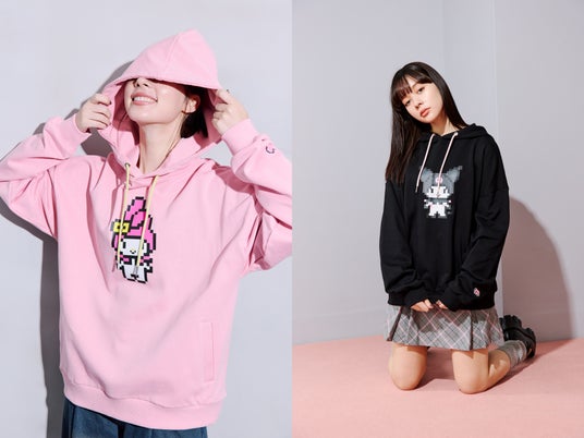 ハローキティ、マイメロディ、クロミを今期注目のピクセル柄に落とし込んだ遊び心満載!袖口のプリントも可愛いワンポイント。
