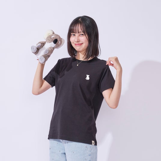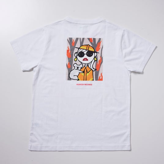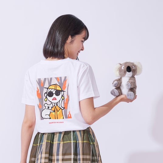 オーストラリアの消防隊員に扮したJosieが森林火災からコアラを救助する姿がバックプリントされたTシャツです。