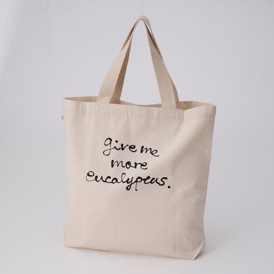 “give me more eucalyptus.”のメッセージと、Josieとコアラのデザインがプリントされたビッグサイズのトートバックです。