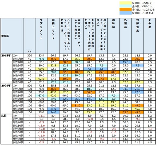 全体を見ると、TOPは2015年と同じ「サプリメント」となり、約11pt減少し、約72%となった。一方で、10pt以上増加したのは、「バランス栄養食品」約24pt増、「お茶」約14pt増、「乳製品」19pt増、「発酵食品」約19pt増の4つ。