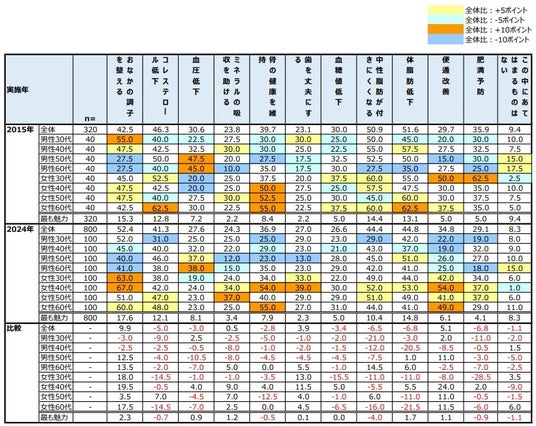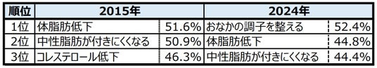 全体で見ると、魅力を感じる効果として、2015年のTOPとやや異なり、「おなかの調子を整える」約52%、「体脂肪低下」約45%、「中性脂肪が付きにくくなる」約44%となった。比較表は下表。