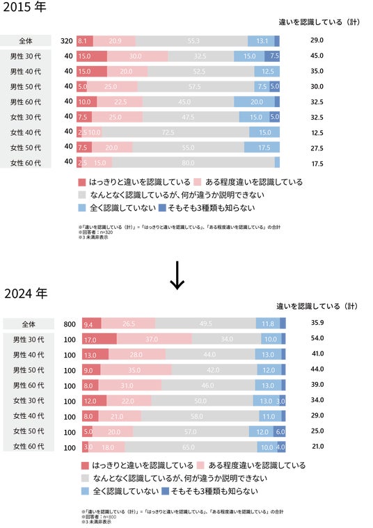 次に、認識の違い別に見ると、「認識しているが、何が違うか説明できない」と「全く認識していない」、「そもそも3種類」も知らないで、それぞれ半分以上の層で2015年から2024年で減少。特に、「認識しているが、何が違うか説明できない」は男性50代、女性40代、60代で約15~16pt減少している。一方で、「ある程度違いを認識している」は、女性30代以外増加しており、男性50代と女性40代は10~11pt増加した。