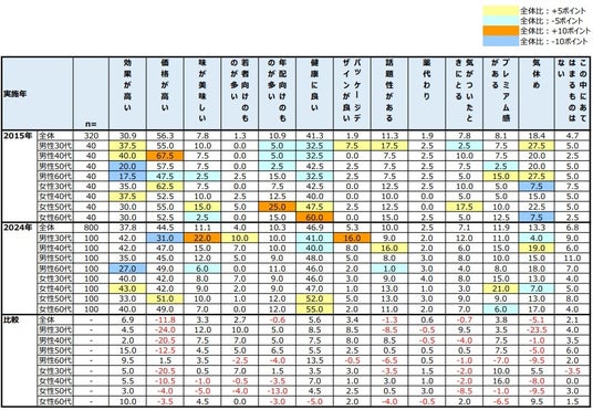 続いて、性年代別で見ると、男性30代で「味が美味しい」と「パッケージデザインが良い」が他の層と比べ、選択率が高い。一方で、男性30代で「価格が高い」、男性60代で「効果が高い」が他の層と比べ、選択率が低い傾向にあった。