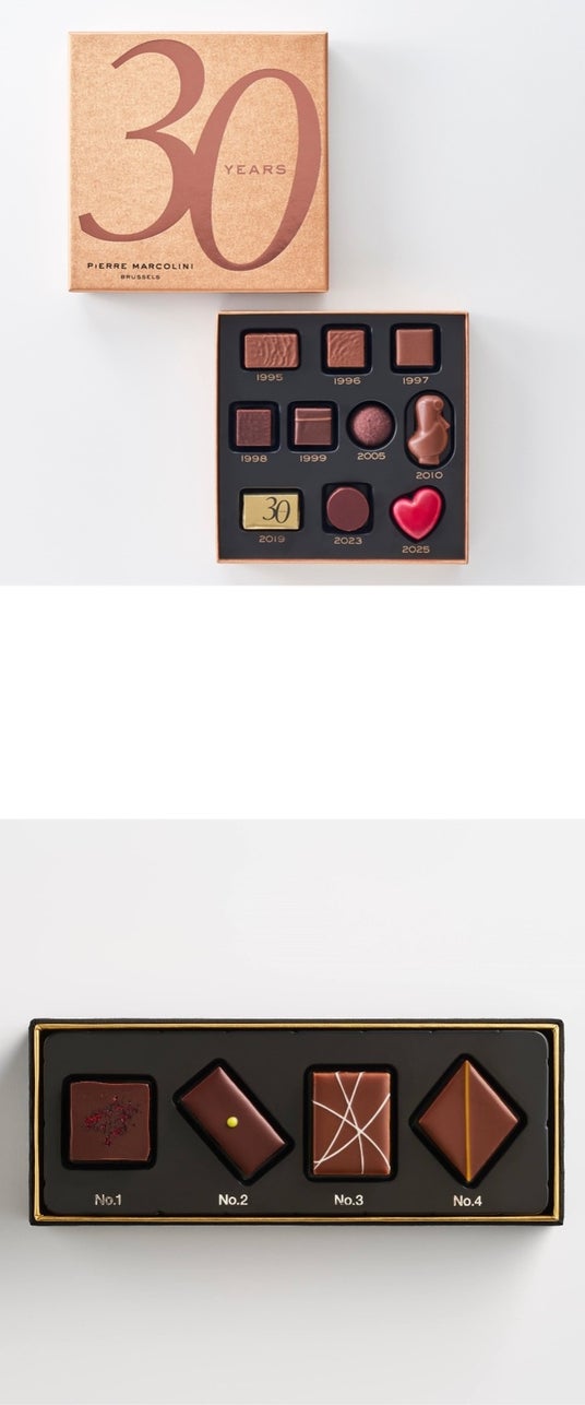 ピエール マルコリーニ30周年を記念した特別なパッケージ。フランボワーズ風味のビターチョコレートガナッシュの「クールココロフランボワーズ」や、ミルクチョコレートの中にフルールドセルとキャラメルソースが入った「アニモキャラメル」など、過去の人気商品から最新作に至るまでの軌跡を堪能できるアーカイブコレクションです。