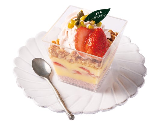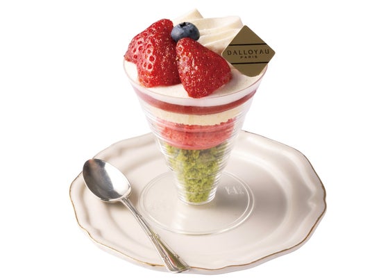 クラッシュしたマカロンピスターシュと、あまおうのマカロン、ジェノワーズ、甘酸っぱい果肉感たっぷりな苺のとろ~りソース、シャンティーを重ね、苺を飾った限定のプティパルフェ。