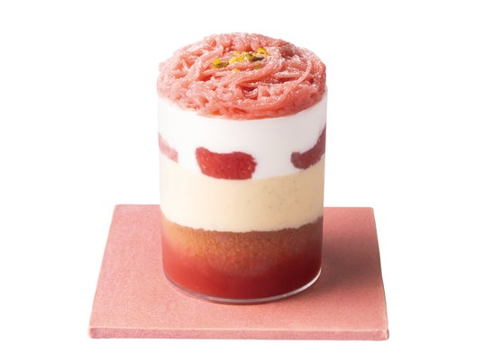 「モンブラン」と「サバラン」、2つのポピュラーな洋菓子を掛け合わせました。キルシュワッサーのシロップを染み込ませたサバラン生地に、濃厚な口当りのバニラプリンと口どけの良い生クリームを重ね、あまおう苺を使った白餡ペーストを糸状に絞って仕上げた、4層重ねの苺スイーツです。