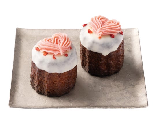 いちご風味のカヌレ生地にホワイトチョコをたっぷりデコレーション。いちごジャム入りのハートのガナッシュと、ドライいちごが、見た目にもかわいいカヌレです。