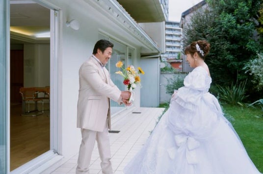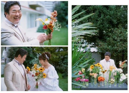 バウリニューアルは既婚のカップルが結婚の誓い(vow)を新たにする(renewal)もので、近年話題のセレモニーです。「誓い合って、というのが結婚式だけだから、改めて今後のことを考えるいいチャンスだと思う」と、来年結婚30周年を迎える健介さん、北斗さんおふたりともに前向きに臨んでくれました。ふたりがドレスアップした姿を披露し合うファーストミートについては、「私たちの(結婚式の)ころにはまだそんなのなかった。(ミートっていうから)何か食べるのかと思った(笑)」と北斗さん。「結婚式で購入したこのドレスは“私の歴史”で、結婚5年目と20年目にも写真を撮った。20年目はちょうど乳がんが分かったタイミングだったので、『これが最後かもしれない』と思ったけど、また着られてうれしい」と覚悟を持ってドレスに袖を通した過去も。
