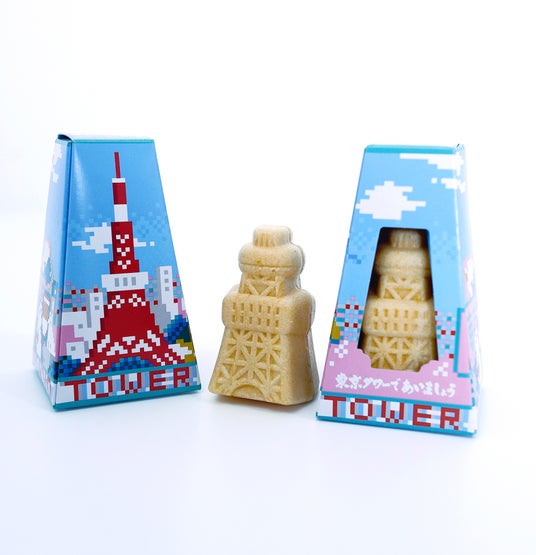 ドット絵で広がる東京風景のパッケージに包まれ、おもちゃのようにコロンと可愛い東京タワー型のさくさくとしたモナカ皮。