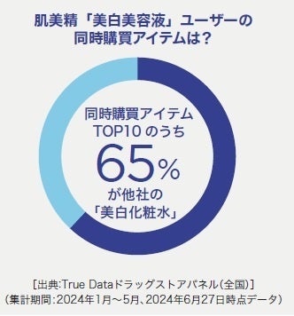 「肌美精 薬用美白美容液」は、2019年発売以来、販売金額が年々伸長しており、その背景には美白有効成分「高純度ビタミンC」と消炎成分「トラネキサム酸」のWの有効成分への関心が高いことや20~30代の方から好評を得ていることがあります。また、「美白美容液」ユーザーの同時購買アイテムには「美白化粧水」が多いことも分かりました。